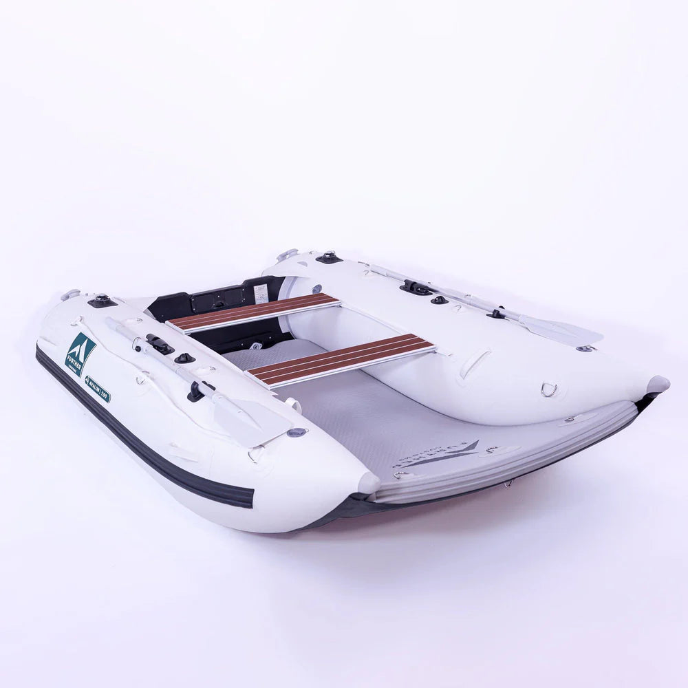 An ultra-stable and responsive inflatable catamaran packed with extra features. Designed with a wide open bow & generous floor space providing room for extra guests and gear. Reinforced with extra protective layers of military grade PVC & impact protective strips. Two aluminum bench seats wrapped in a plush EVA provide a comfortable area for seating for multiple passengers. A durable, safe & impressive vessel that can be easily transported by the included wheeled carrying bag.